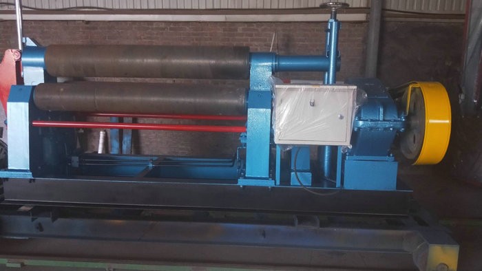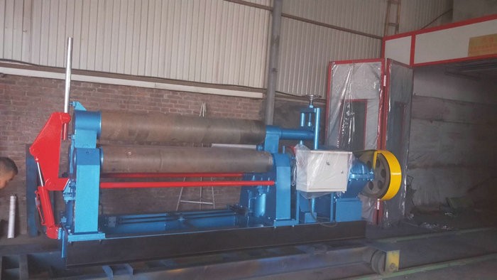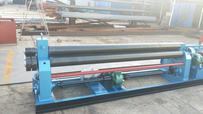 液壓下拉式卷板機主要特點:該機上輥可以垂直升降,垂直升降的液壓傳動,通過液壓缸內(nèi)的液壓油作用活塞桿而獲得;下輥作旋轉(zhuǎn)驅(qū)動,通過減速機輸出齒輪嚙合,為卷板提供扭矩,下輥下部有托輥,并可調(diào)節(jié)。上輥呈鼓形狀,提高制品的直線度,適用于超長規(guī)格各種截面形狀罐。